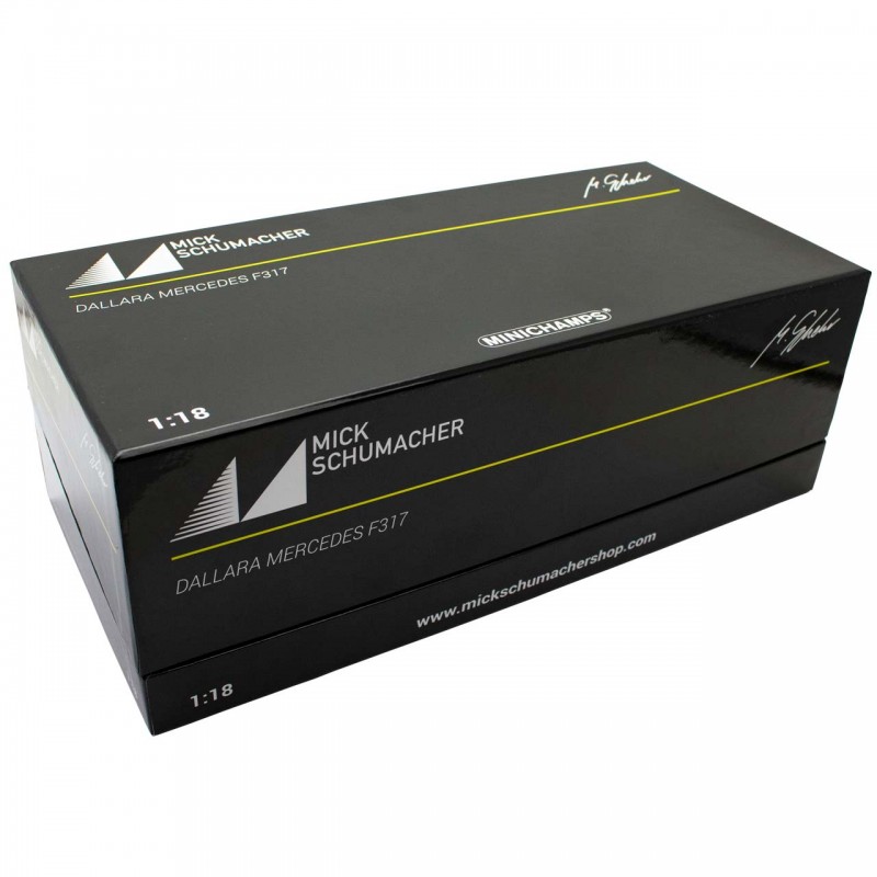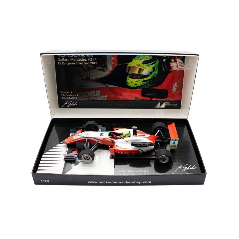 The Minichamps™ Mick Schumacher, PREMA Theodore Racing Dallara F317 Mercedes-Benz in scale 1:18 is a faithful and detailed model car of Mick Schumachers racing car from the 2018 FIA Formula 3 season. This model car comes in an exclusive collectors box and is limited to 500 pieces